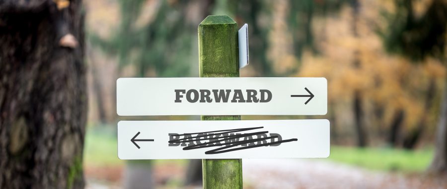 Rural signboard with two signs saying – Forward – Backward – pointing in opposite directions with the sign saying Backward scribbled through and an arrow pointing to the route forwards to success.
